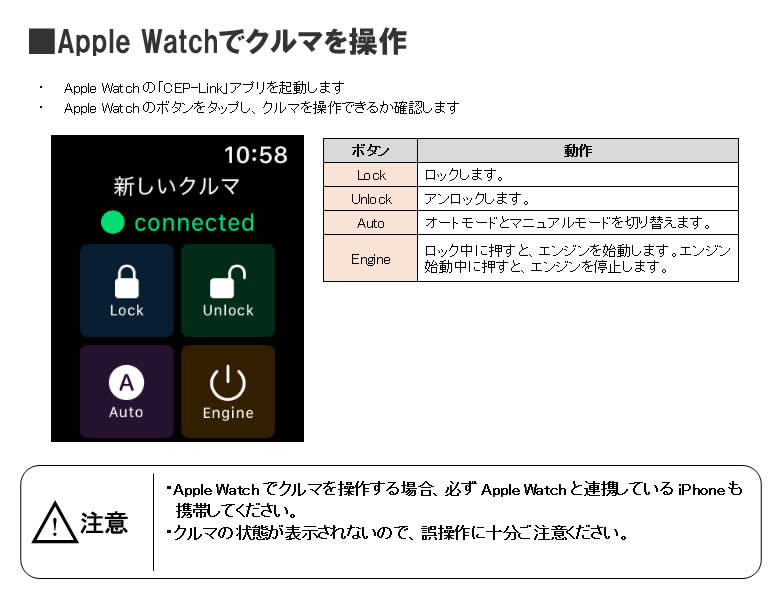 ソニックスタート5 スマホ対応セット(Ver1.4〜)と組み合わせることで、Apple Watchからクルマを操作できます。